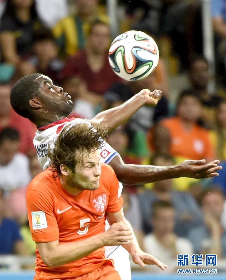 7月5日,荷兰队球员达·布林德(前)在比赛中争顶。 新华社记者吕小炜摄