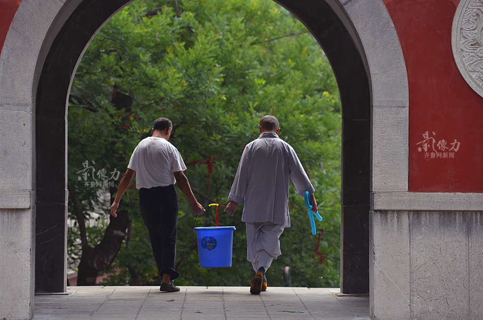 由于寺院地处山上,海拔较高,自来水经常断流,用水不便。午课前,僧人打水归来。齐鲁网记者 于鹏/摄 满倩/文