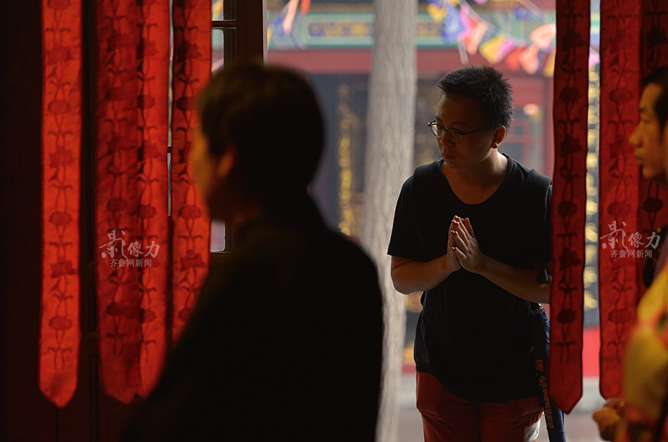 一位虔诚的佛教信徒双手合十跟随僧人唱经。齐鲁网记者 于鹏/摄 满倩/文
