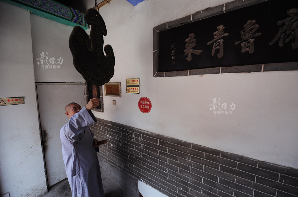 中午11点半,僧人“打板”后,进入斋堂用斋,佛语即“过堂”。齐鲁网记者 于鹏/摄 满倩/文