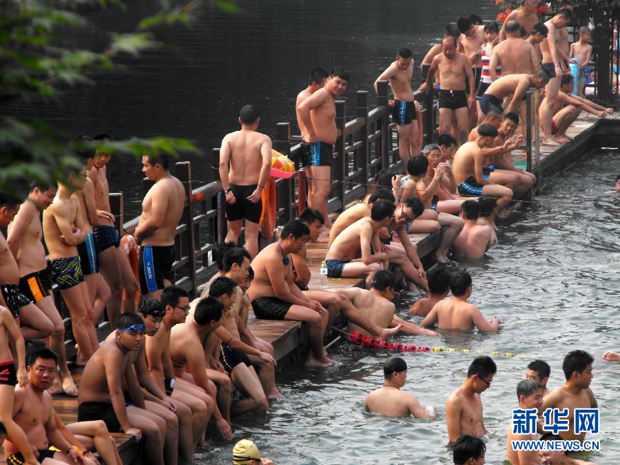 7月6日,济南一家免费浴场人满为患。当日,周末的济南又闷又热,免费的泉水浴场成了市民避暑好去处,人满为患,犹如“下饺子“。新华社发