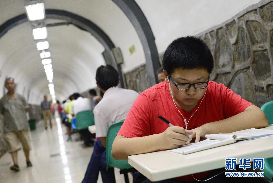 7月8日,学生在位于西安市安东街的西安人防纳凉中心写作业。当日上午10时,陕西省西安市气象台发布橙色高温预警信息,预计24小时内西安市大部分地区最高气温要上升至37℃以上,许多市民前往西安人防纳凉中心乘凉。新华社记者刘潇 摄