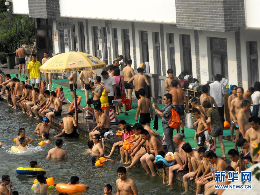 7月6日,济南一家免费浴场人满为患。当日,周末的济南又闷又热,免费的泉水浴场成了市民避暑好去处,人满为患,犹如“下饺子“。新华社发