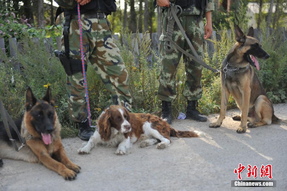 9月2日,哈尔滨延寿县公安局看守所内,三名犯人将一名管教杀死后逃走。三人逃走时都穿着警服,一人着警服外衣,一人穿短袖夏装,一人穿长袖秋装。警方对每名嫌犯悬赏15万元缉拿。图为投入搜捕的武装警犬。中新社发王舒摄