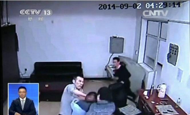 据央视新闻报道,看守所内监控显示,2日凌晨4点19分43秒,一名带着脚镣的犯人向走廊尽头行走,随后又有两名犯人悄悄走出监舍。一名男子先是探头探脑的观察了一下值班室,然后勒住民警的脖子,另外两人也冲进屋内,联手将狱警放倒。随后换上警服走到接待大厅的铁门处,徘徊许久后走出。图片来源:央视新闻微博