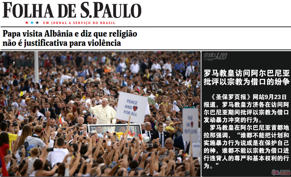 《圣保罗页报》9月23日报道,罗马教皇方济各在访问阿尔巴尼亚期间批评以宗教为借口发动暴力冲突的行为。