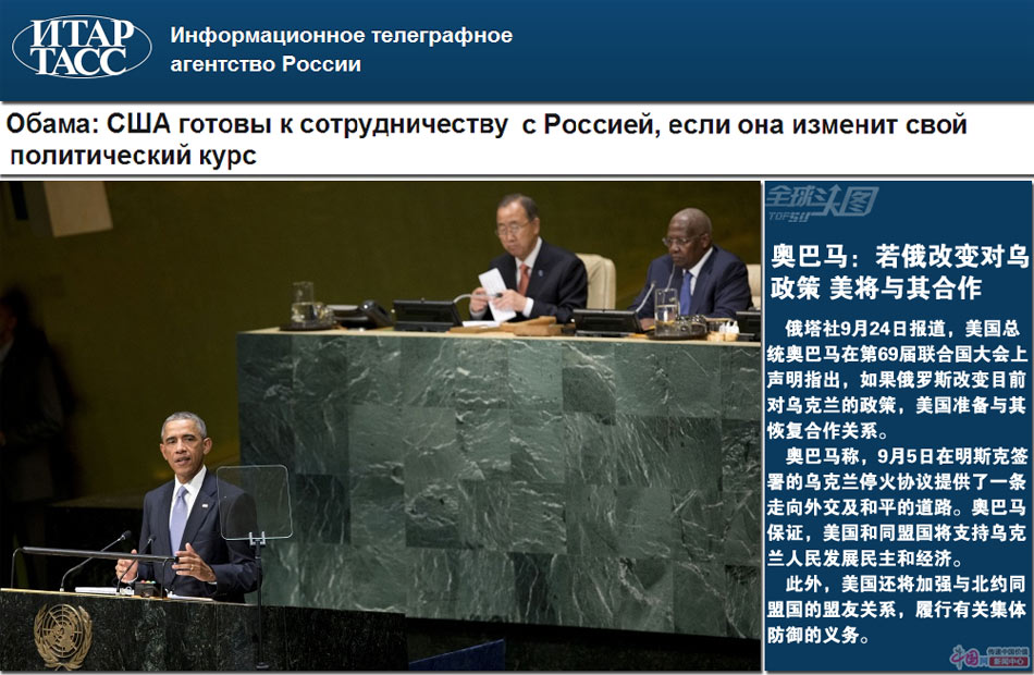 俄塔社9月24日报道,美国总统奥巴马在第69届联合国大会上声明指出,如果俄罗斯改变目前对乌克兰的政策,美国准备与其恢复合作关系。