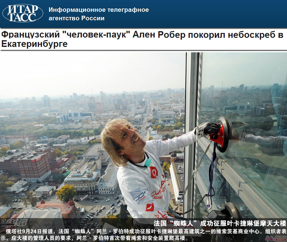 俄塔社9月24日报道,法国“蜘蛛人”阿兰?罗伯特成功征服叶卡捷琳堡最高建筑之一的维索茨基商业中心。组织者说,应大楼的管理人员的要求,阿兰?罗伯特首次带着绳索和安全装置爬高楼。