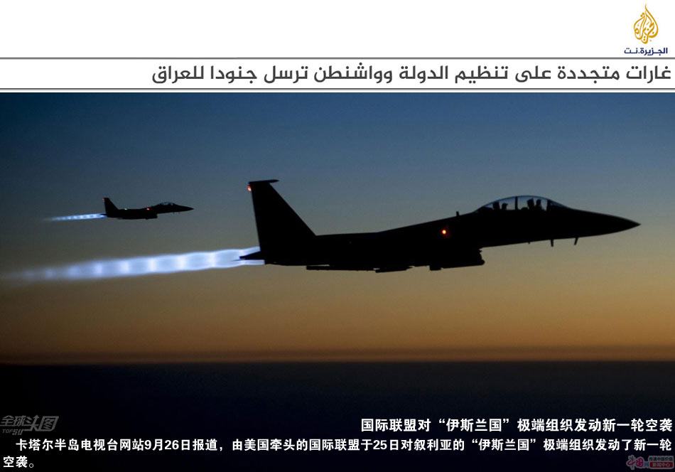 卡塔尔半岛电视台网站9月26日报道,由美国牵头的国际联盟于9月25日对叙利亚的“伊斯兰国”极端组织发动了新一轮的空袭,空袭目标是位于叙利亚东部代尔祖尔省米亚丁市的“伊斯兰国”极端组织的基地和活动中心。