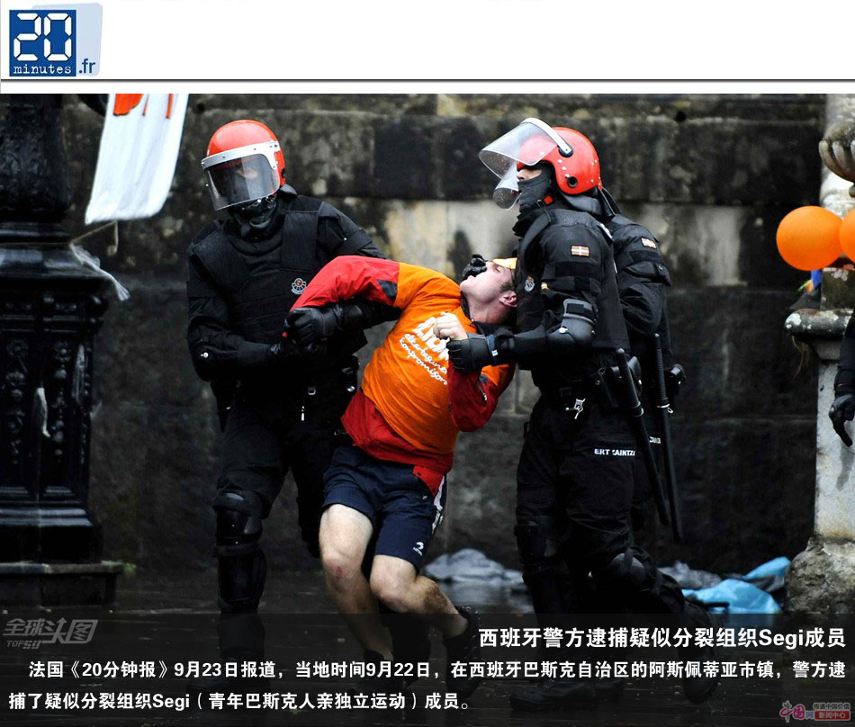 法国《20分钟报》9月23日报道,当地时间9月22日,在西班牙巴斯克自治区的阿斯佩蒂亚市镇,警方逮捕了疑似分裂组织Segi(青年巴斯克人亲独立运动)成员。