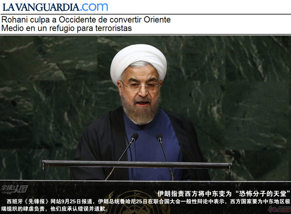 西班牙先锋报9月25日报道,伊朗总统鲁哈尼25日在联合国大会一般性辩论中表示,西方国家要为中东地区极端组织的肆虐负责,他们应承认错误并道歉。