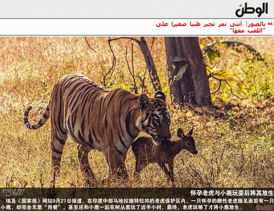 埃及《国家报》网站9月27日报道,在印度中部马哈拉施特拉邦的老虎保护区内,一只怀孕的雌性老虎眼见面前有一只小鹿,却完全无意“用餐”,甚至还和小鹿一起在树丛里玩了近半小时,似乎是在为日后育儿做准备。虽然小鹿因老虎“母爱泛滥”而逃过一劫,但仍难掩惊恐之情,一得到机会便迅速逃跑,但总是会被老虎叼着脖子捉回。最终,老虎玩够了才将小鹿放生。