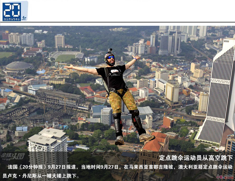 法国《20分钟报》9月27日报道,当地时间9月27日,在马来西亚首都吉隆坡,澳大利亚籍定点跳伞运动员卢克丹尼斯从一幢大楼上跳下。