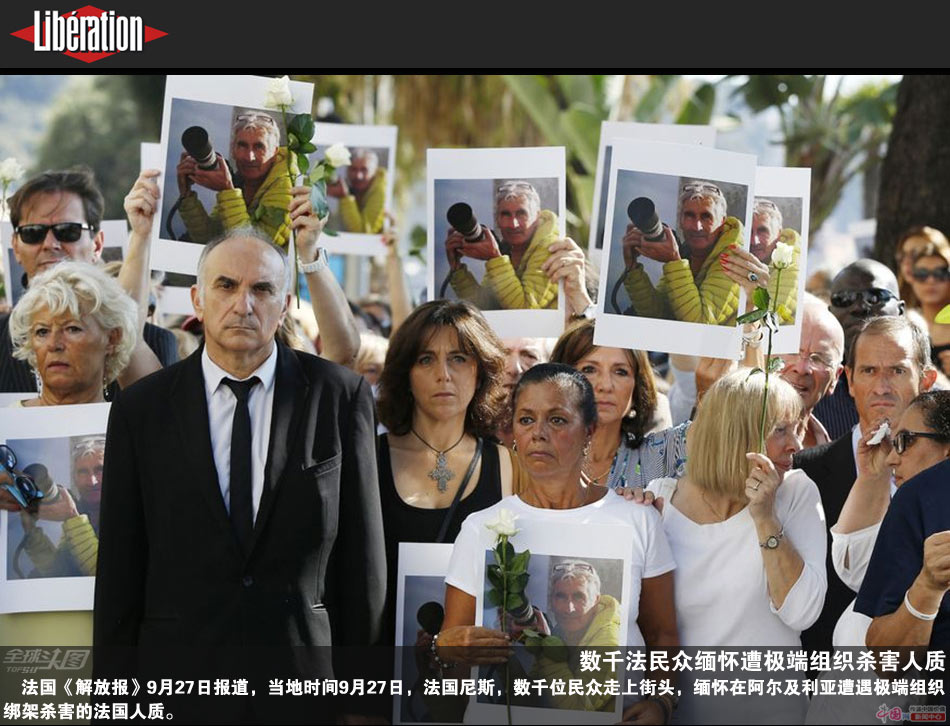 法国《解放报》9月27日报道,当地时间9月27日,法国尼斯,数千位民众走上街头,缅怀在阿尔及利亚遭遇极端组织绑架杀害的法国人质古德尔(Hervé Gourdel)。