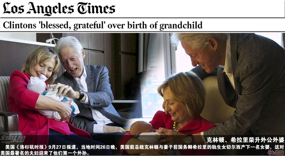 美国《洛杉矶时报》9月27日报道,当地时间26日晚,美国前总统克林顿与妻子前国务卿希拉里的独生女切尔西产下一名女婴,这对美国最著名的夫妇迎来了他们第一个外孙。荣升为外公和外婆的克林顿和希拉里在各自的“推特”账号上转发这一喜讯。图片中希拉里抱着外孙,克林顿则在一旁兴奋地逗小孩,两人看上去十分幸福。