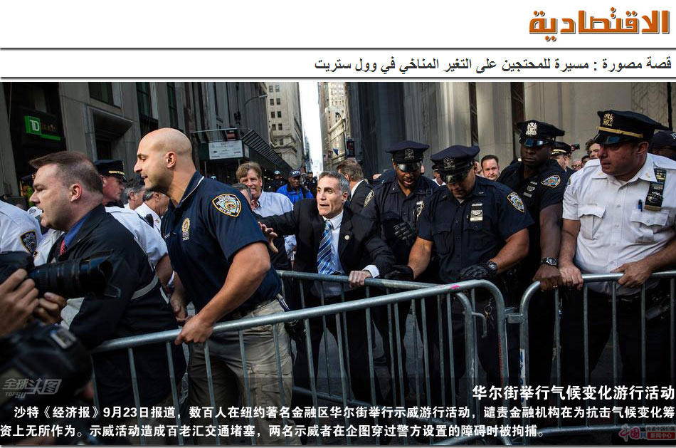 沙特《经济报》9月23日报道,数百人在纽约著名金融区华尔街举行示威游行活动,谴责金融机构在为抗击气候变化筹资上无所作为。示威活动造成百老汇交通堵塞,两名示威者在企图穿过警方设置的障碍时被拘捕。