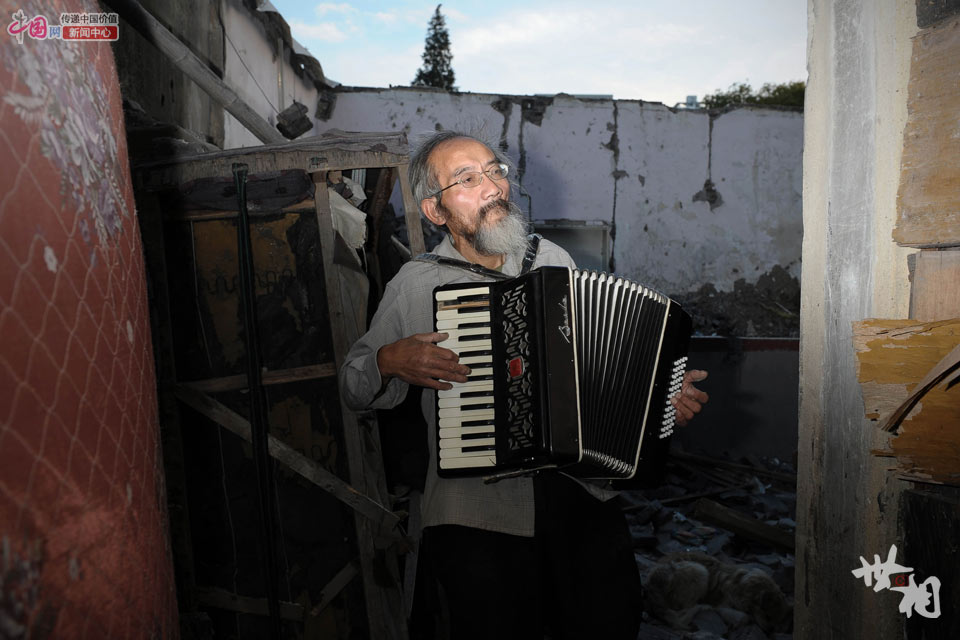 2014年10月28日,老史在一个荒废的小院子里拉手风琴。