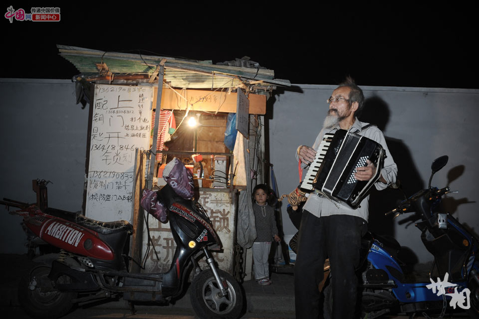 2014年10月28日,老史在董家渡路上的一间修锁棚前拉手风琴。