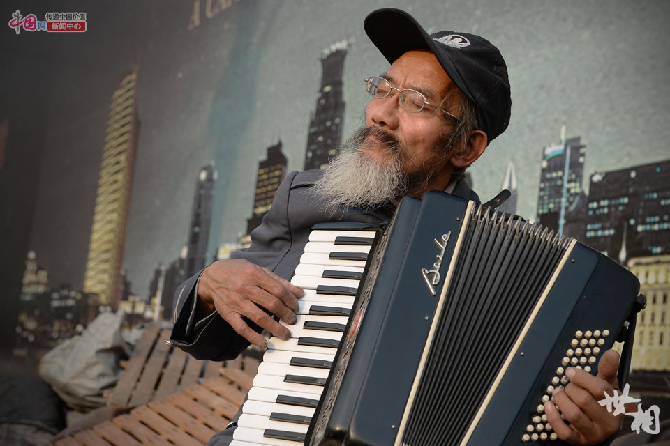 2014年10月15日,老史在董家渡王家嘴角街上用手风琴演奏《莫斯科郊外的晚上》。曲到情浓处,老史闭上双眼,陶醉在自己的曲声中。