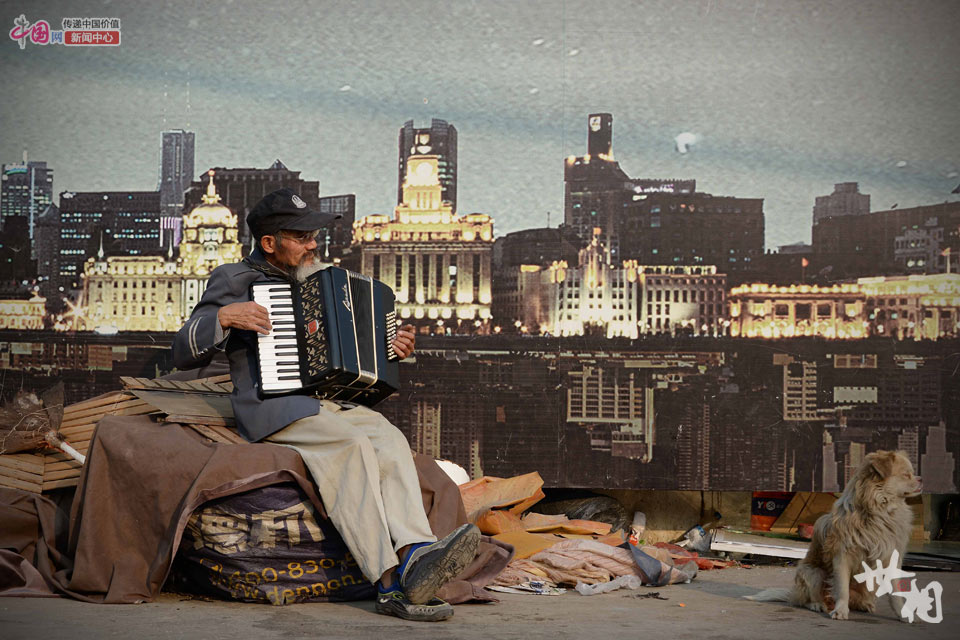 2014年10月15日,上海董家渡王家嘴角街,老史坐在一幅巨大的房地产广告画下,为过往的行人拉手风琴,他的头号粉丝宠物狗“宁宁”陪伴在一旁。