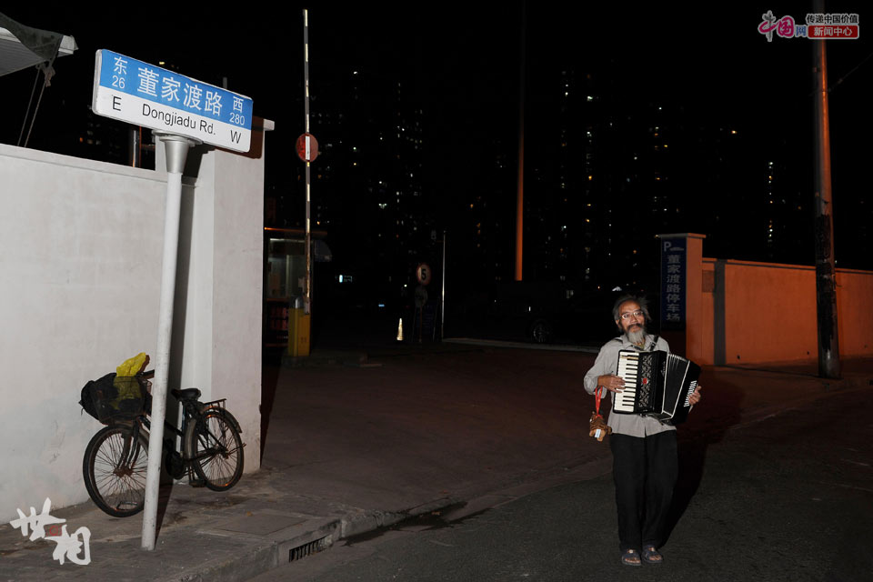 2014年10月28日,老史在董家渡路上拉手风琴,这条马路贯穿了董家渡地区。