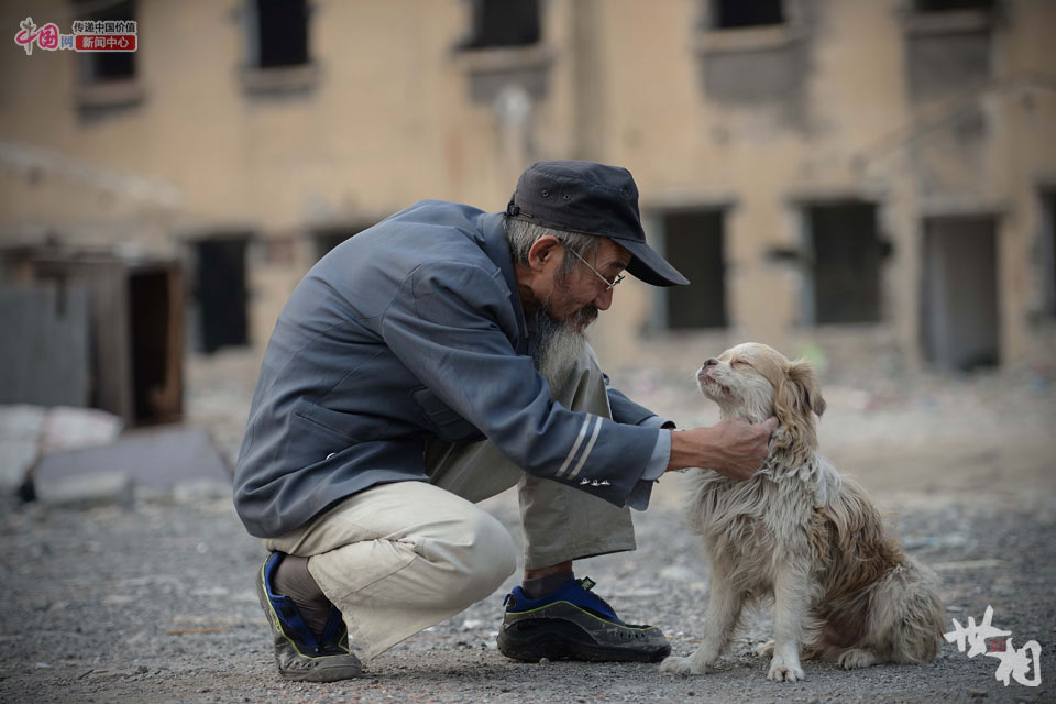 2014年10月15日,老史在给宠物狗“宁宁”梳理毛发,“宁宁”露出了无比满足的表情。这只狗是附近居民搬家时留下的,多年前被老史收养,他们已成为形影不离的伙伴。