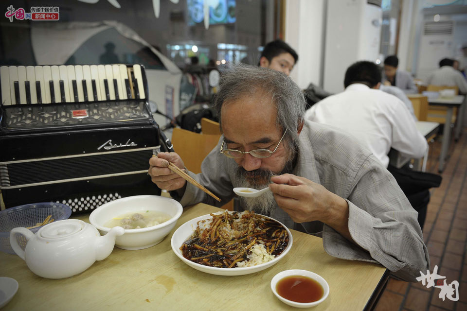 2014年10月28日,老史在董家渡一家快餐店吃晚餐,今晚他点了一盘鳝丝盖浇饭和一碗小馄饨,消费24元。每月2000多元的退休金,维持着老史的日常支出。餐后,他把剩下的一点食物打包回去喂宠物狗“宁宁”。