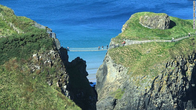 11、卡里克索绳桥(Carrick-a-Rede Rope Bridge) 北爱尔兰安特里姆郡 这座桥最初是为捕食鲑鱼的渔民而造,以便他们穿过30米深、20米宽的峡谷,去检查他们的渔网。不过,后来却成为北爱尔兰最受欢迎的旅游景点之一。人们还热衷于在桥上做各种特技,其中有一位当地人在桥中心放置椅子,进行倒立表演。附近的一间羊岛视觉旅馆挂了一组相关的照片来吸引游客。