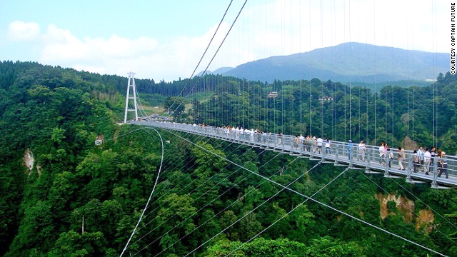 12、九重梦悬索桥(Kokonoe `Yume` Grand Suspension Bridge) 日本大分县 它建于2006年,共有390米长,现为世界上最长的悬索桥,距河面173米。大分县拥有日本近五分之一的温泉。在桥上可以一睹九重町瀑布的美丽风光,而穿过悬索桥,则可以在附近的温泉里放松身心。难怪游客蜂拥而至,享受这“梦境般的美好”。