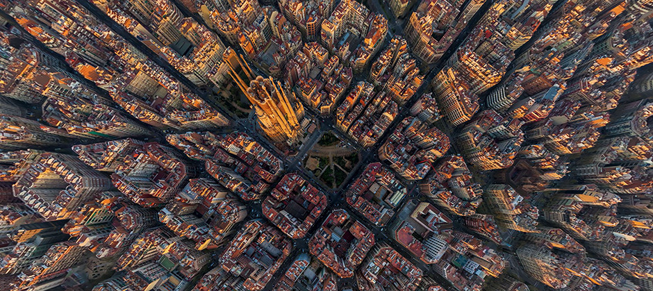 西班牙巴塞罗那:城市与伟大建筑师安东尼奥·高迪的名字紧密相连。摄影师在航拍过程中力争将高迪所有著名的建筑物收入其中,凸显城市设计之美。画面正中间的圣家族大教堂,从1882年开始建造,直到现在都没有完工。(网站截图)