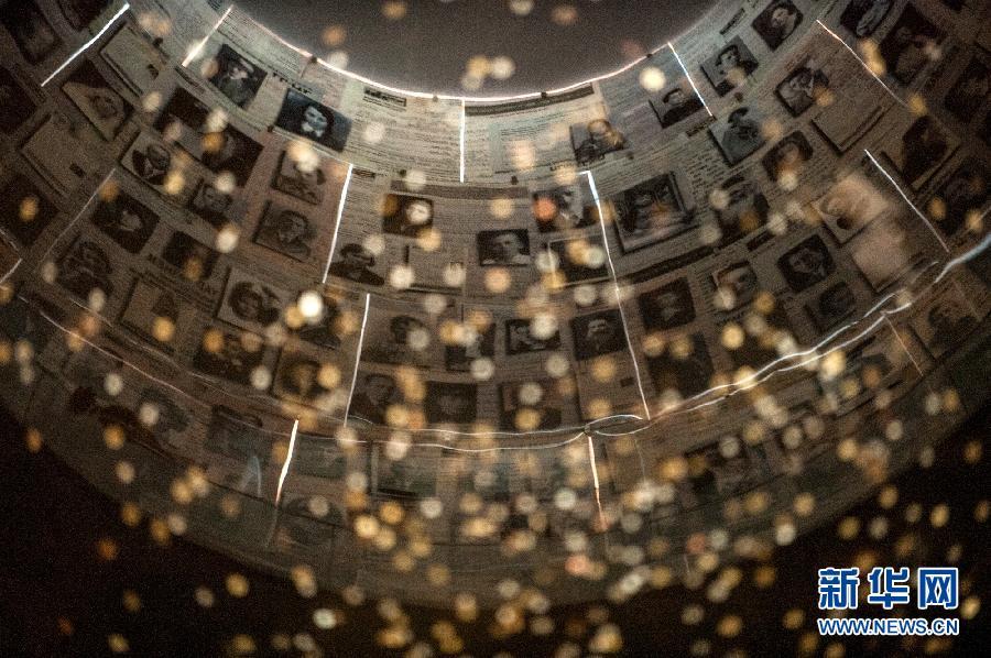 2014年4月28日,在耶路撒冷的亚德韦希姆大屠杀纪念馆的遇难者姓名纪念厅,大屠杀遇难者的照片映在水中。新华社记者李睿摄图片来源:新华网