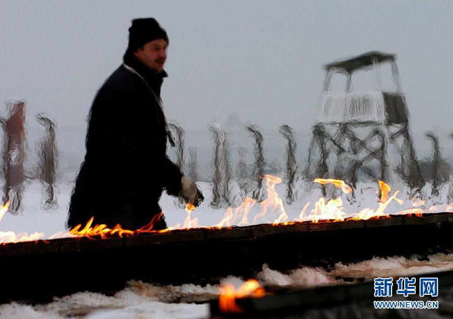2005年1月25日,在波兰南部的奥斯威辛集中营遗址,一名工作人员走过燃烧的铁轨。当年,犹太人就是通过这条铁轨被送入死亡集中营。新华社记者吴晓凌摄图片来源:新华网