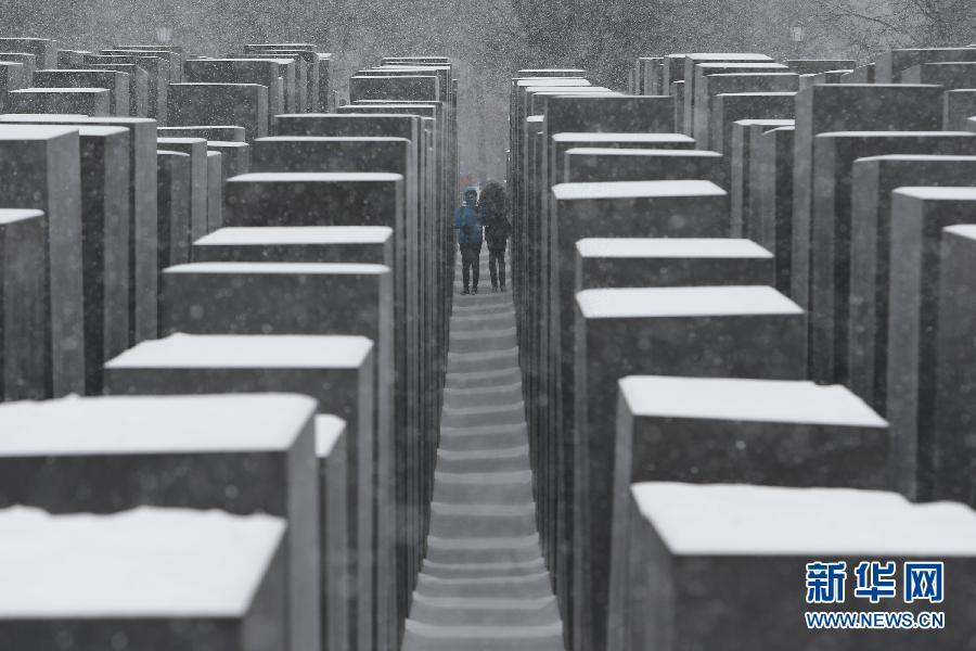 2014年1月27日,在德国首都柏林,两名游客走过犹太人纪念碑群。 新华社记者张帆摄 图片来源:新华网