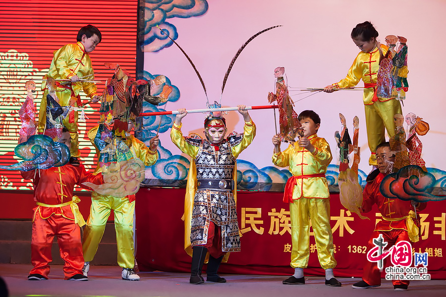2015年2月2日,中国首届“袖珍人”春晚在北京举办,本次“袖珍人”春晚一共有来自全国各地的80多为位袖珍演职员。他们自编自导自演了20余个节目,用自己的方式,向全国人民拜年。图为皮影戏《十八罗汉斗悟空》中国网记者郑亮摄影
