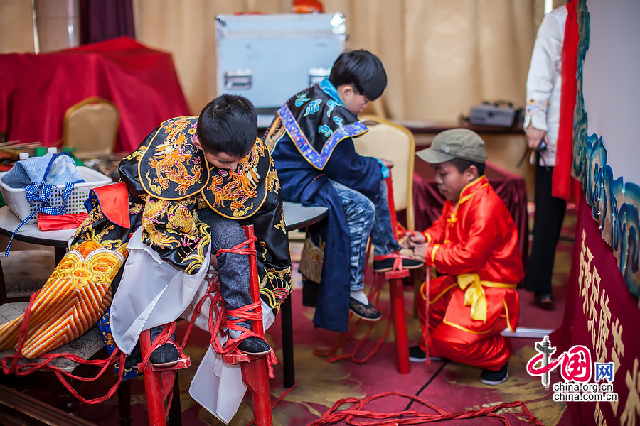 在后台准备上场彩排的袖珍演员,由于特殊的身体原因,很多时候他们穿戴道具都需要在同伴的帮助下才可以完成。中国网记者 郑亮摄影