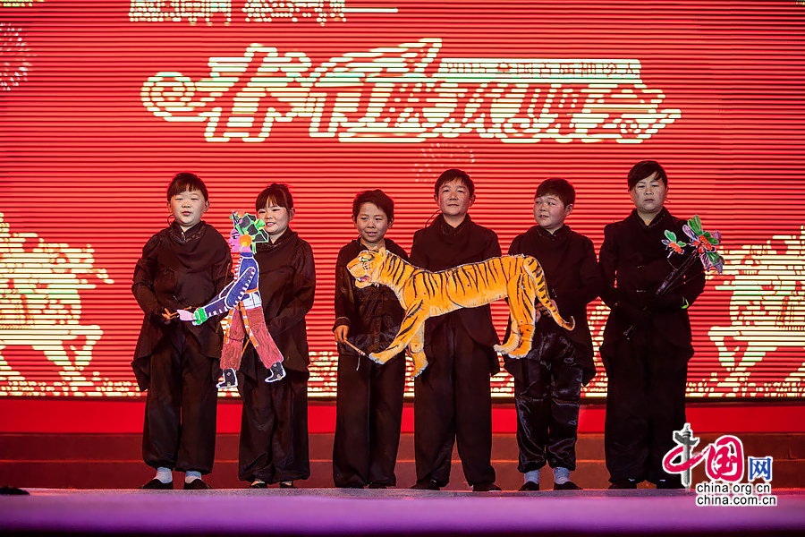 2015年2月2日,中国首届“袖珍人”春晚在北京举办,本次“袖珍人”春晚一共有来自全国各地的80多为位袖珍演职员。他们自编自导自演了20余个节目,用自己的方式,向全国人民拜年。图为荧光影戏《老虎苍蝇一起打》。中国网记者郑亮摄影