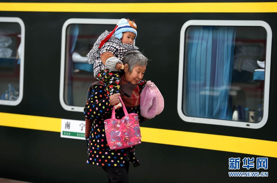 2月7日,在安徽亳州火车站站台上,一名老人带着孩子赶路,准备回家过年。 新华社发(刘勤利 摄)