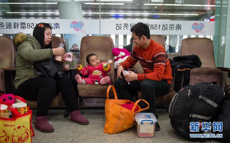 8个月大的柳瑞颖(中)在经历她出生以来的第一个春运——从南京乘火车到陕西榆林。图为爸爸柳炳(右)、妈妈王翠在“雷锋服务站”照顾她(2月7日摄)。