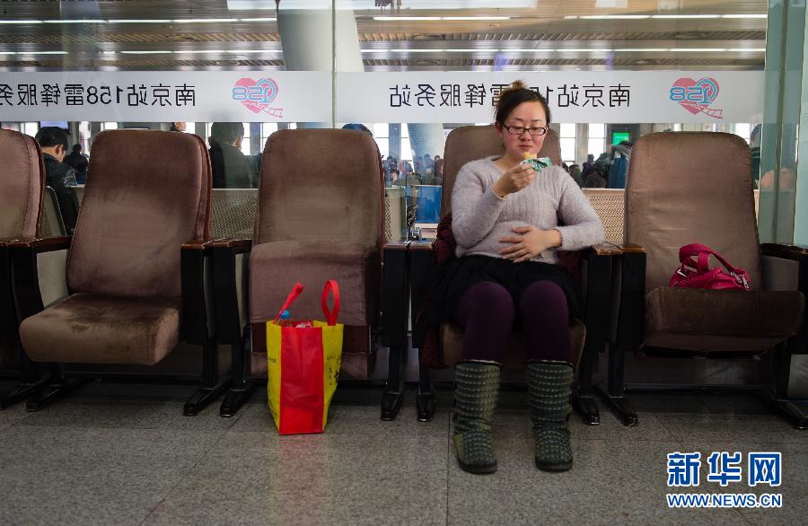 33岁的东北人邢儒菲已经怀孕3个月。平时在安徽当高中老师的她决定独自一人回哈尔滨老家过年图为邢儒菲在南京火车站“雷锋服务站”吃东西补充营养(2月7日摄)。