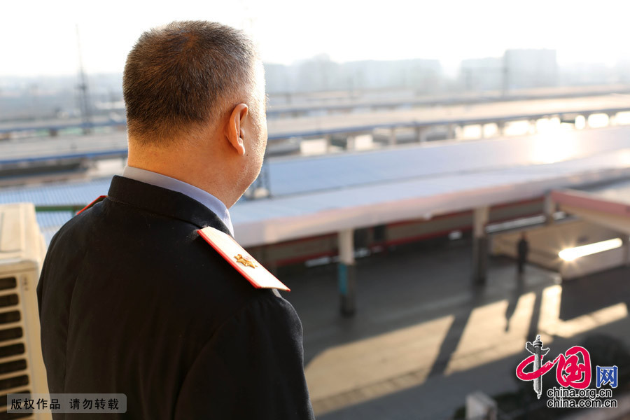 2月10日上午8:45分,下班后的孙黎走出行车员值班室,远远望去在站台工作的儿子孙腾。中国网图片库郭志华摄影