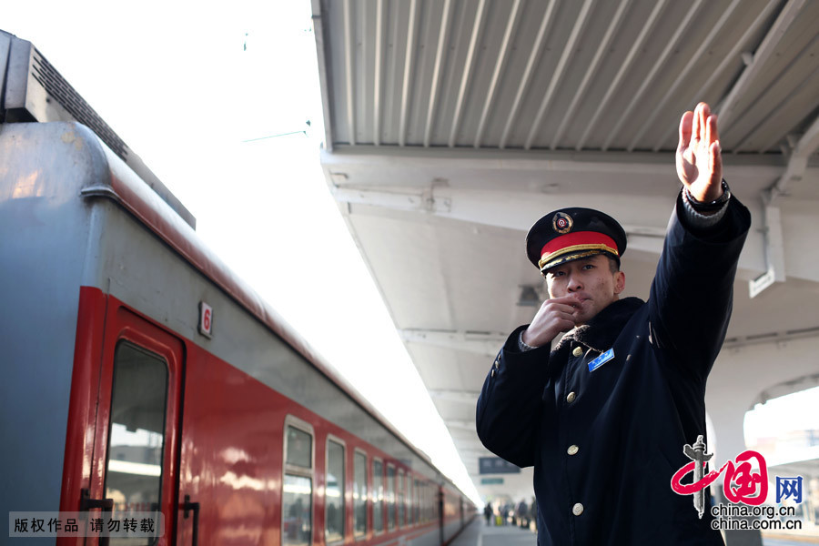 2月10日上午9点,坚守岗位的孙腾吹哨并招手示意旅客注意安全。中国网图片库郭志华摄影