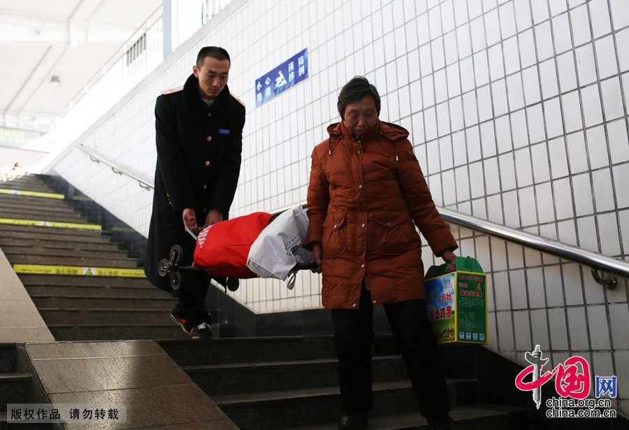 2月10日上午9点5分,下班后的孙腾帮旅客搬运行李。中国网图片库郭志华摄影
