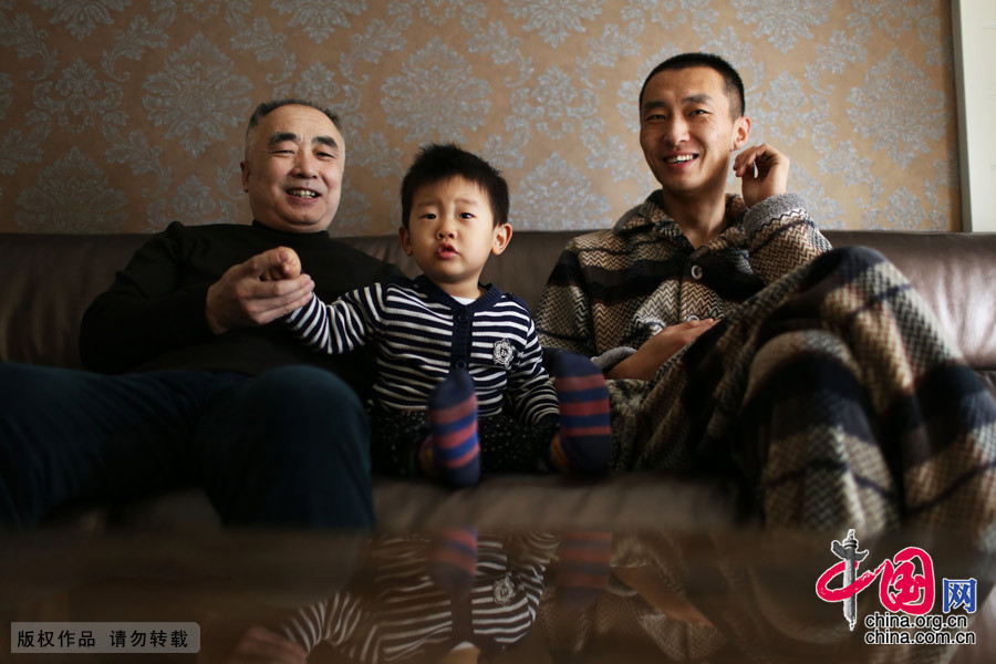 2月11日10点,在孙腾家中,孙黎、孙铭泽、孙腾(从左到右)三代人坐在沙发上看电视。中国网图片库郭志华摄影