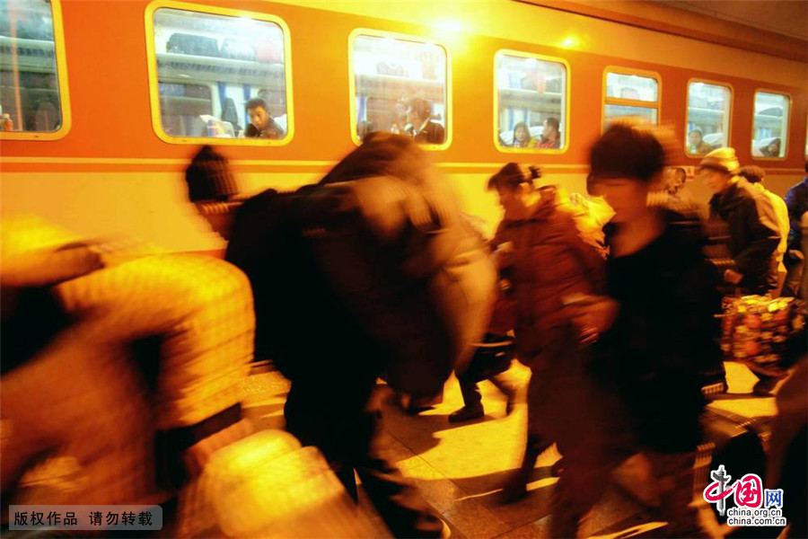 2月13日,山东青岛城阳火车站,像春运以来每天一样,晚上7时44分和8时38分,济南铁路局加开的K5506和K5022次青岛北开往菏泽的返乡民工专列都要在这里,承接一千余名返乡民工回家过年。