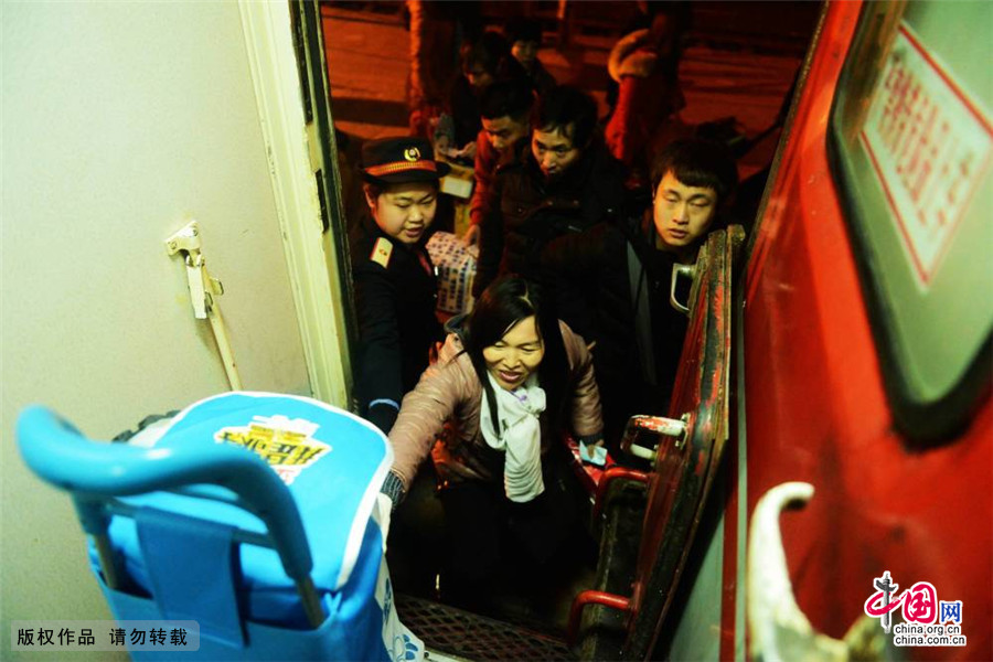2015年2月13日,山东青岛城阳火车站,K5022次返乡民工专列乘客在登车。中国网图片库 俞方平/摄