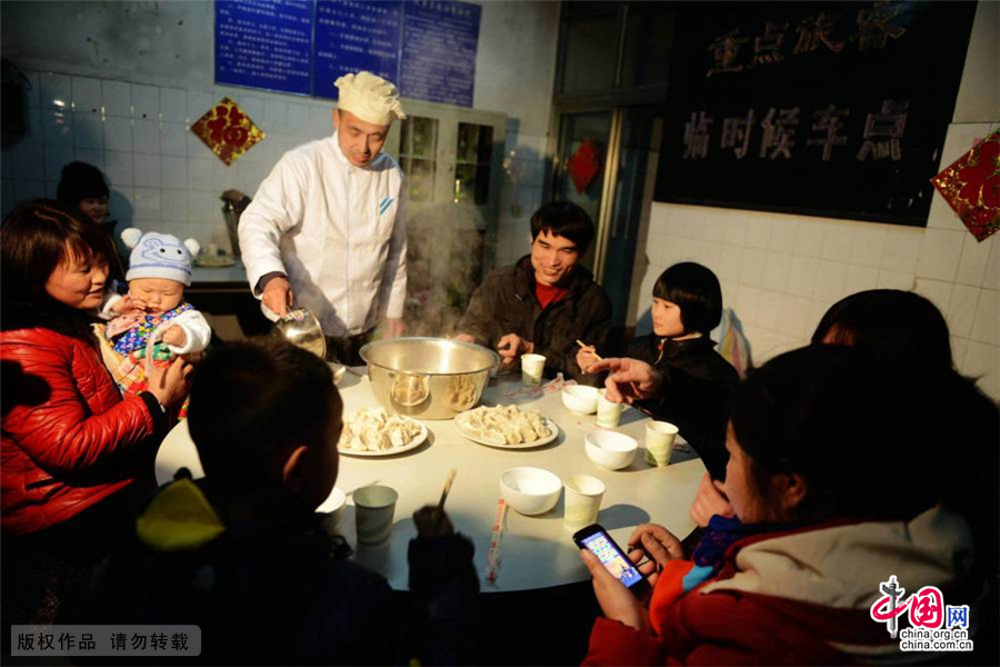 2015年2月13日,山东青岛城阳火车站,车站在重点旅客临时候车点为返乡老弱妇孺旅客免费提供刚出锅的饺子。中国网图片库 俞方平/摄