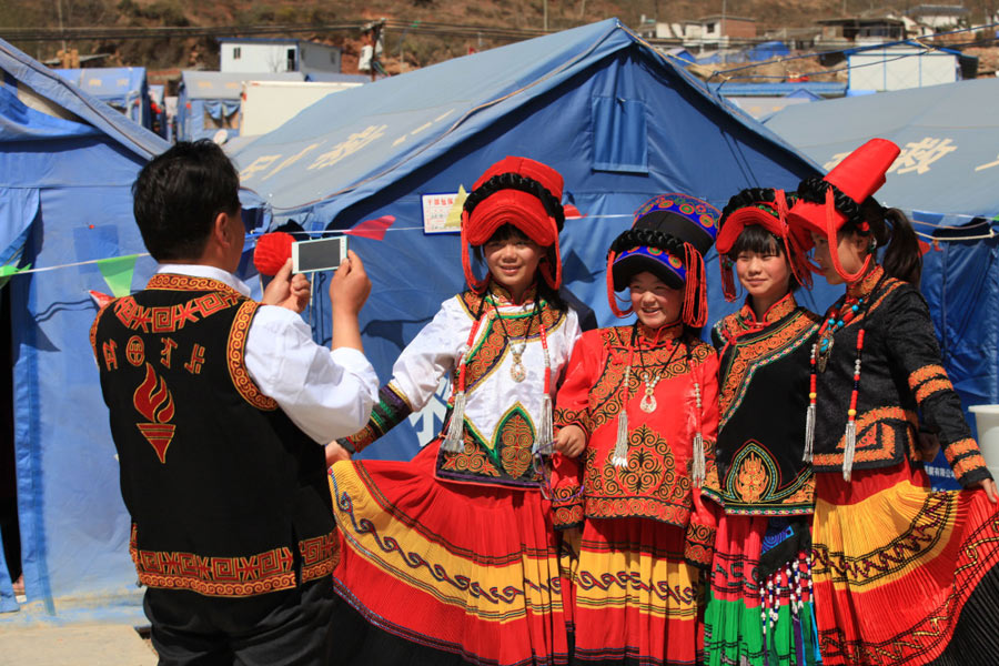 2015年2月19日,云南省昭通市鲁甸县龙头山镇地震灾区灰街子安置点,几位彝族同胞穿上了节日盛装,在帐篷前留影。中国网图片库张广玉摄影