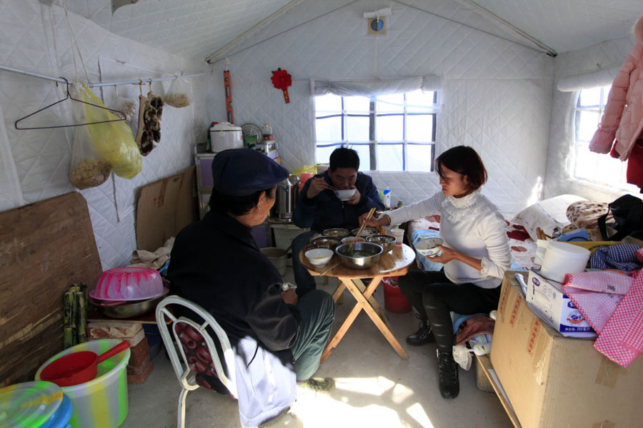2015年2月19日,云南省昭通市鲁甸县龙头山镇地震灾区灰街子安置点,一家三口在帐篷内吃新年的第一顿团年饭。中国网图片库张广玉摄影