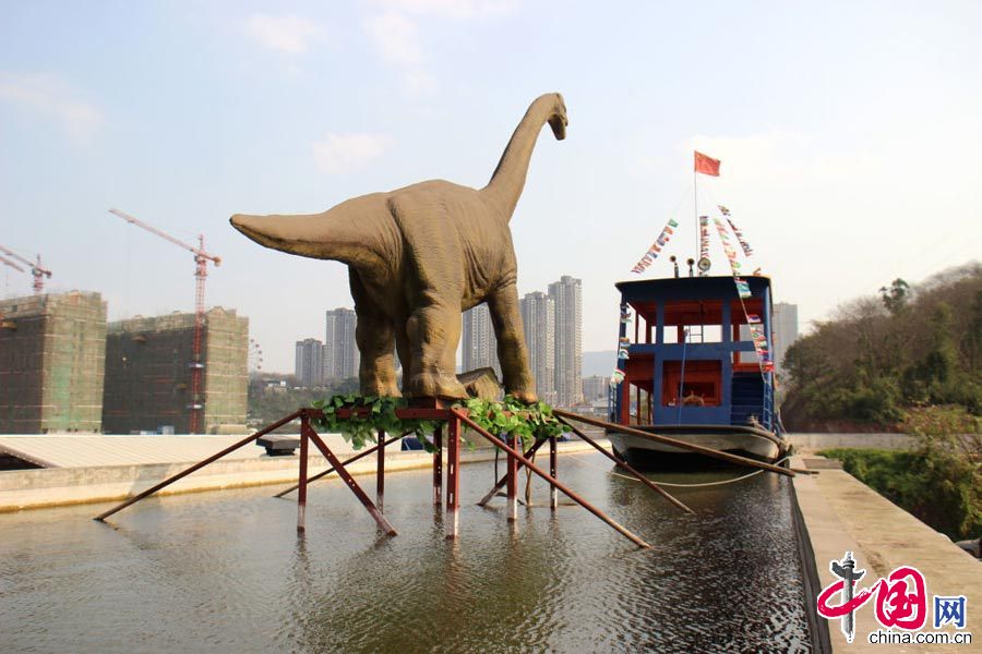 2015年3月7日,重庆洋人街,一条人造“天河”离地10余米盘旋在空中,硕大的轮船和“恐龙”在“天河”中对峙,上演龙船大战,市民连连称奇,被称为“最任性的人造天河”。中国网图片库刘向龙摄影