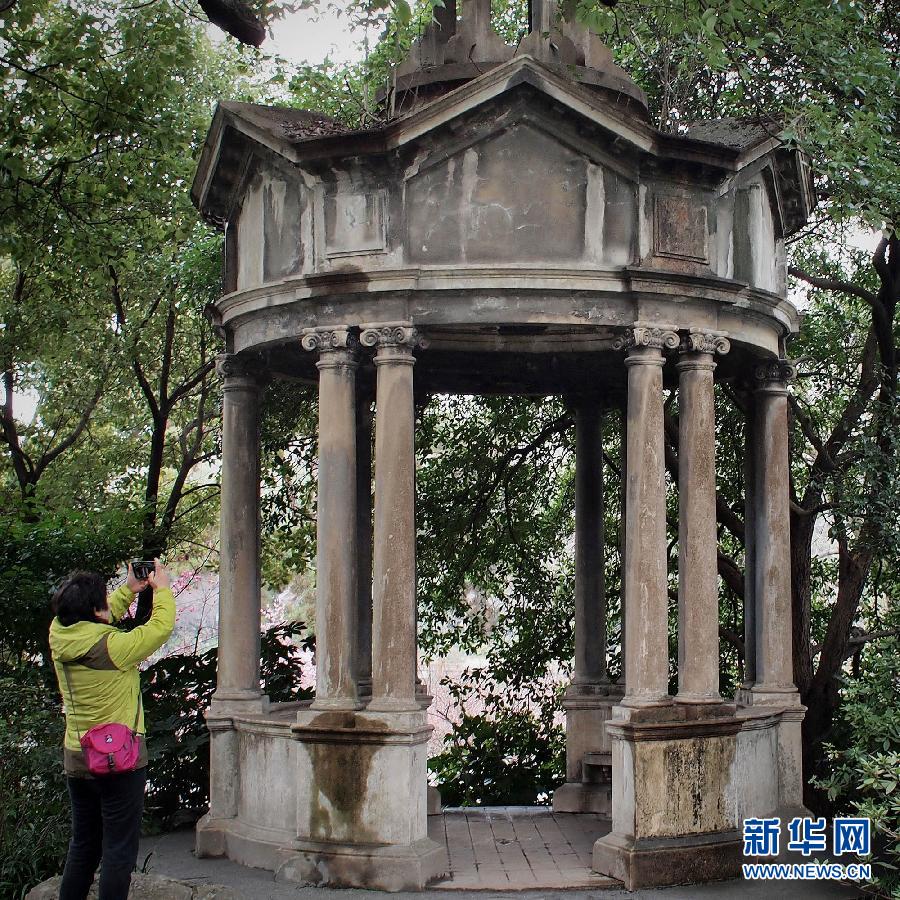 在杭州中山公园内,一位市民在中山纪念亭前拍照(2015年3月1日摄)。